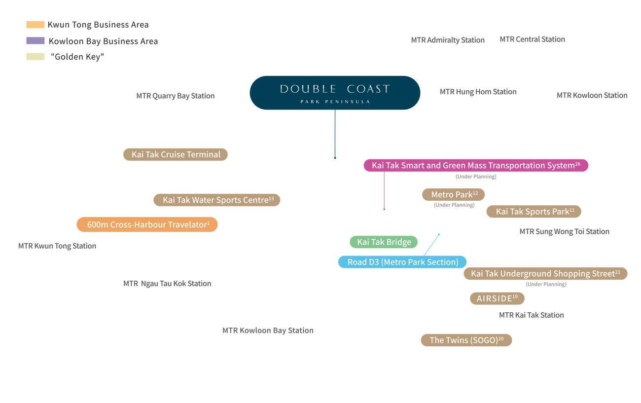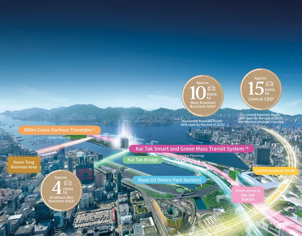 Kai Tak Bridge, about 600m Cross-Harbour Travelator (under planning)1 and D3 road (Metro Park section) - the 3 major routes connect Kai Tak, Kowloon Bay and Kwun Tong in Kowloon East CBD.